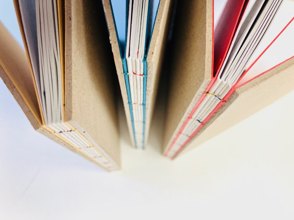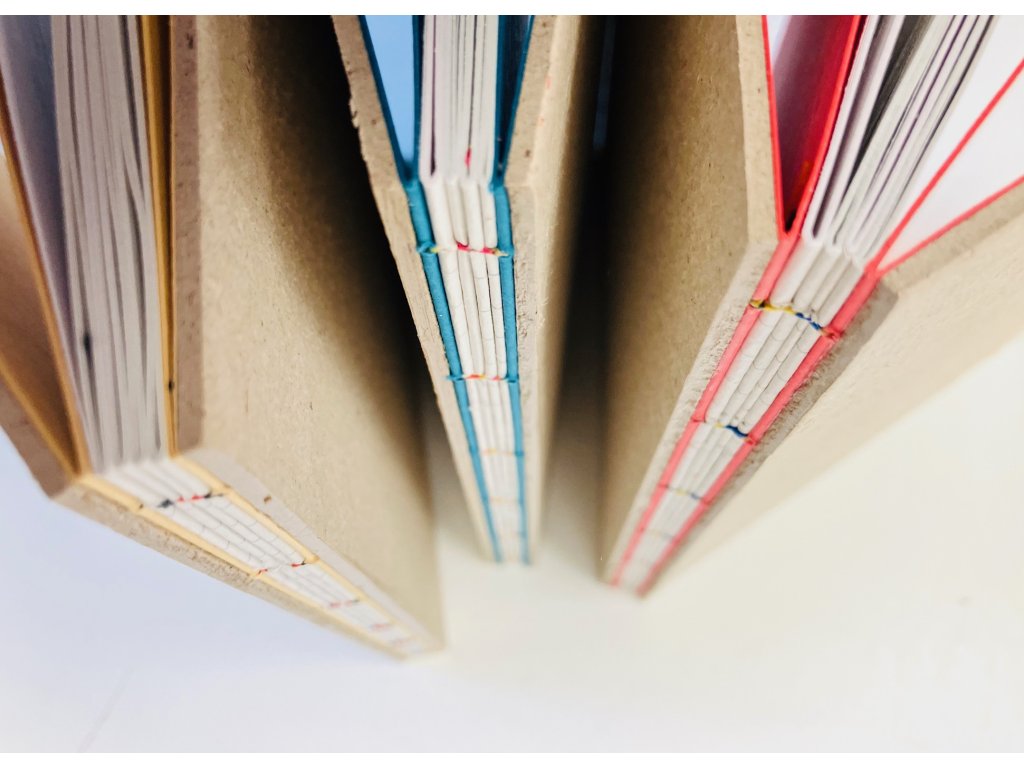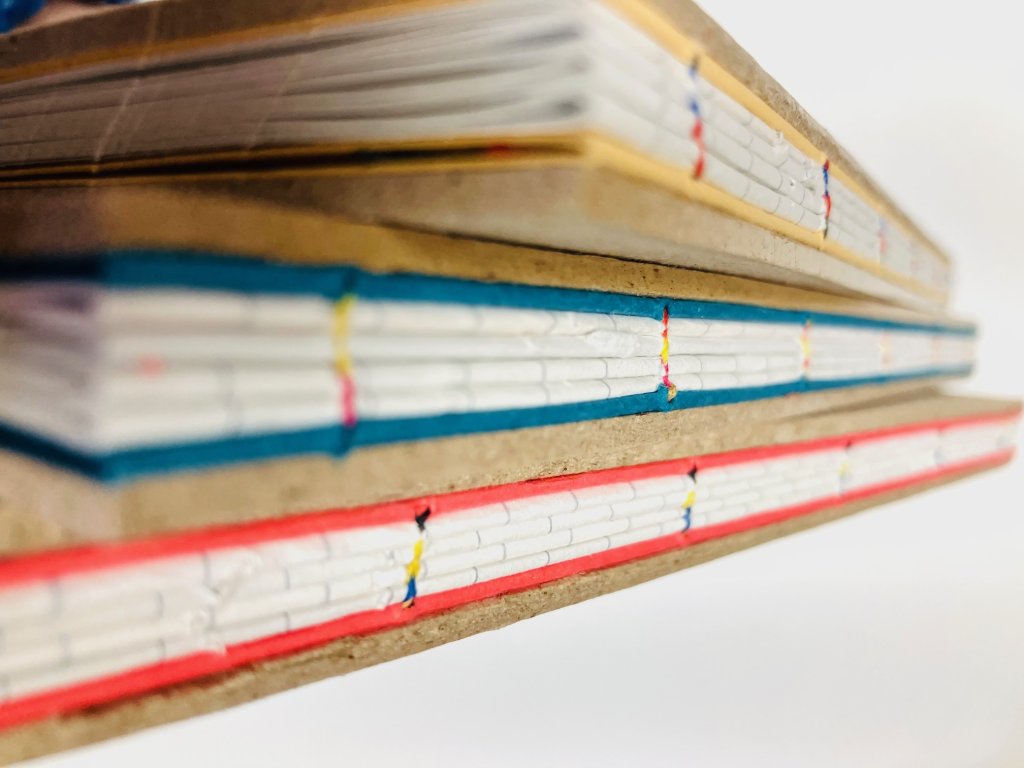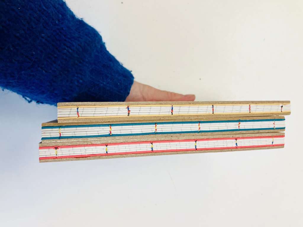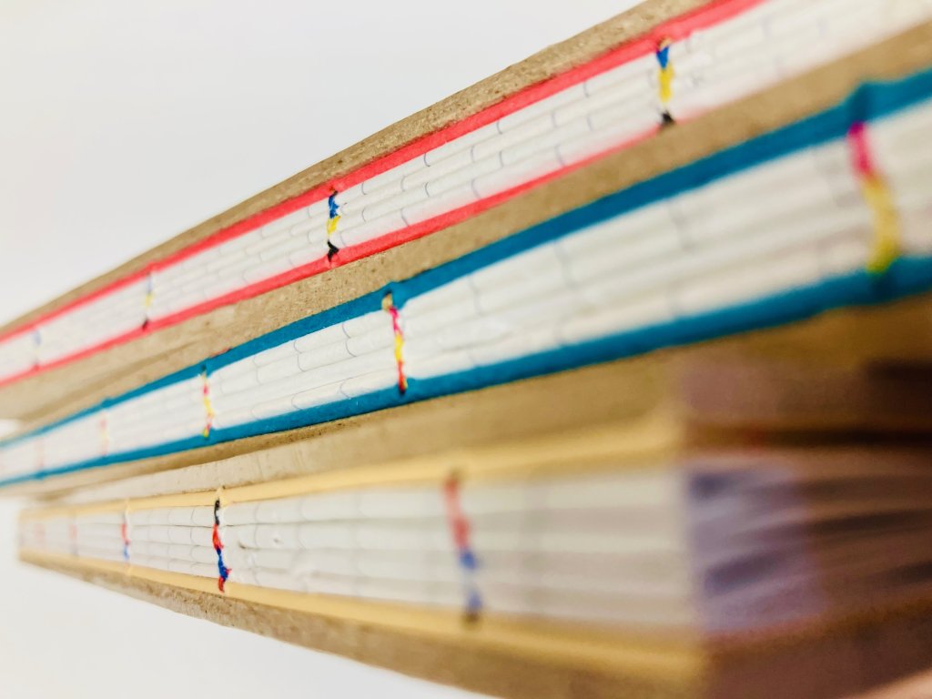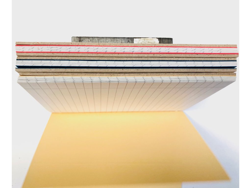 Vypreparované nepopsané listy ze školních sešitů starších žáků, takže linky klasické. Stejné, a přece trochu jiné, v jednom bloku pět složek linek různých papírů a různých původů, sešité dohromady ústřižky nití, hřbet tak duhově mění barvu.