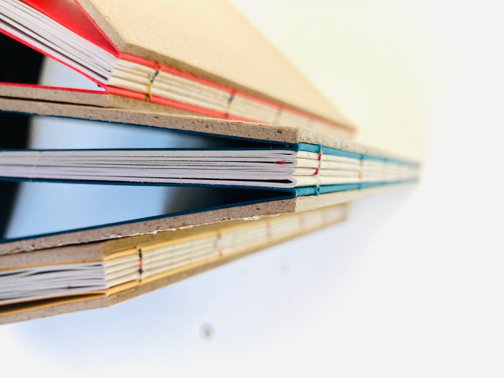 Deník v tvrdých deskách, upcyklovaných ze starého knihařství.